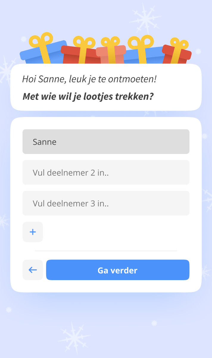 Vul de namen in van iedereen waarmee je lootjes wil trekken. Vul daarna de details van de viering in, zoals een groepsnaam, de vieringsdatum en het cadeaubedrag.
