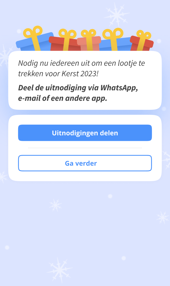Nodig alle deelnemers uit om een lootje te trekken. Je kunt de uitnodigingen versturen via WhatsApp, e-mail, SMS, Facebook Messenger of elke andere populaire app.
