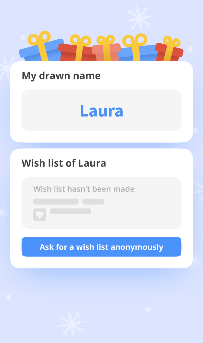 Enter the names of people you want to invite to your Secret Santa. Set exclusions: who shouldn't draw who. Select a date and pick a budget for your Secret Santa gift exchange.